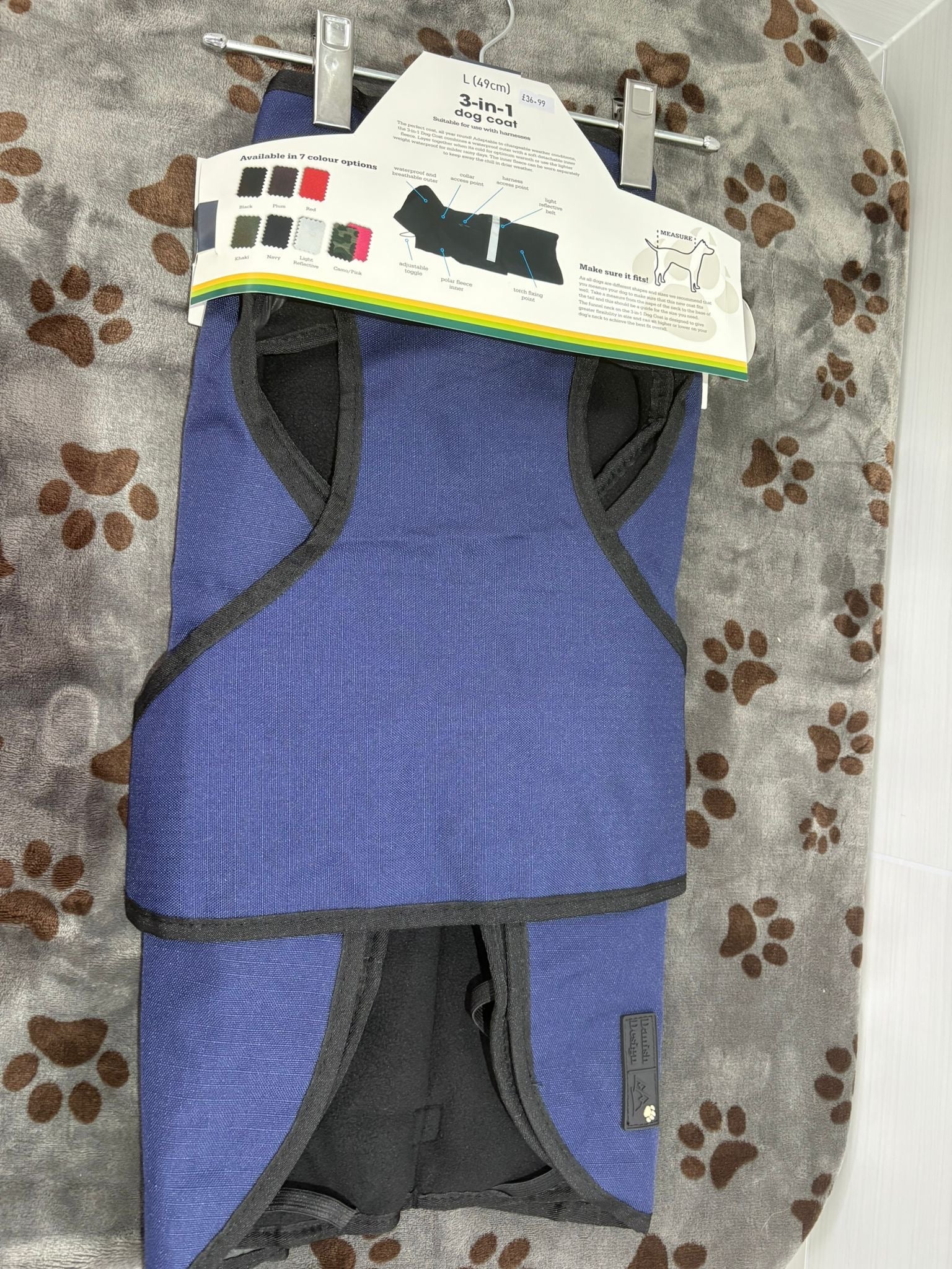 This dog coat is the perfect coat to protect from the changing weather, whilst being suitable for use with harnesses or regular collar and leads. Removable soft inner fleece, with easy-fit velcro fastenings.