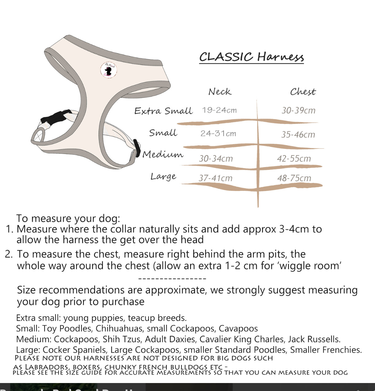*Please note corduroy is a luxury thicker fabric than our usual harnesses therefore doesnt have as much 'give' around the neck and chest strap - if your dog is on the max setting in our usual style, we suggest considering ordering the size up